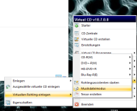 Als erstes müssen wir den virtuellen Brenner mit einem virtuellen Rohling versorgen. Dazu rechtsklickt man auf das Virtual CD Icon in der Taskleiste, fährt mit der Maus auf den virtuellen Brenner, klickt dann auf virtuellen Rohling einlegen und wählt „Musikdateimodus“. Hier mal ein Screenshot dazu: